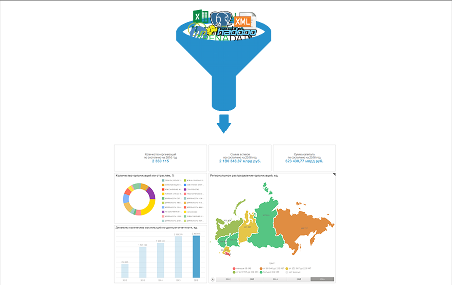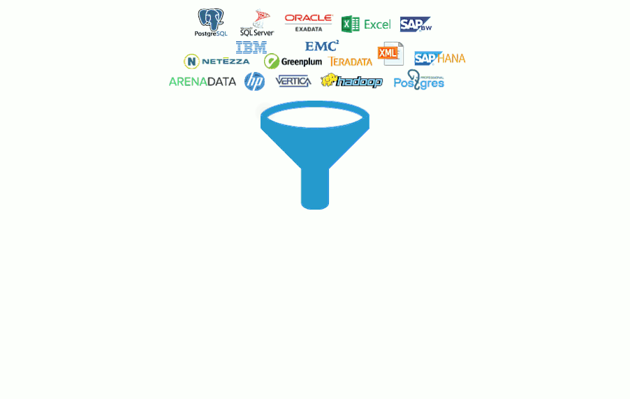 - Используйте самые разные источники: от Excel-файлов и наиболее популярных реляционных СУБД до внешних многомерных и Hadoop источников