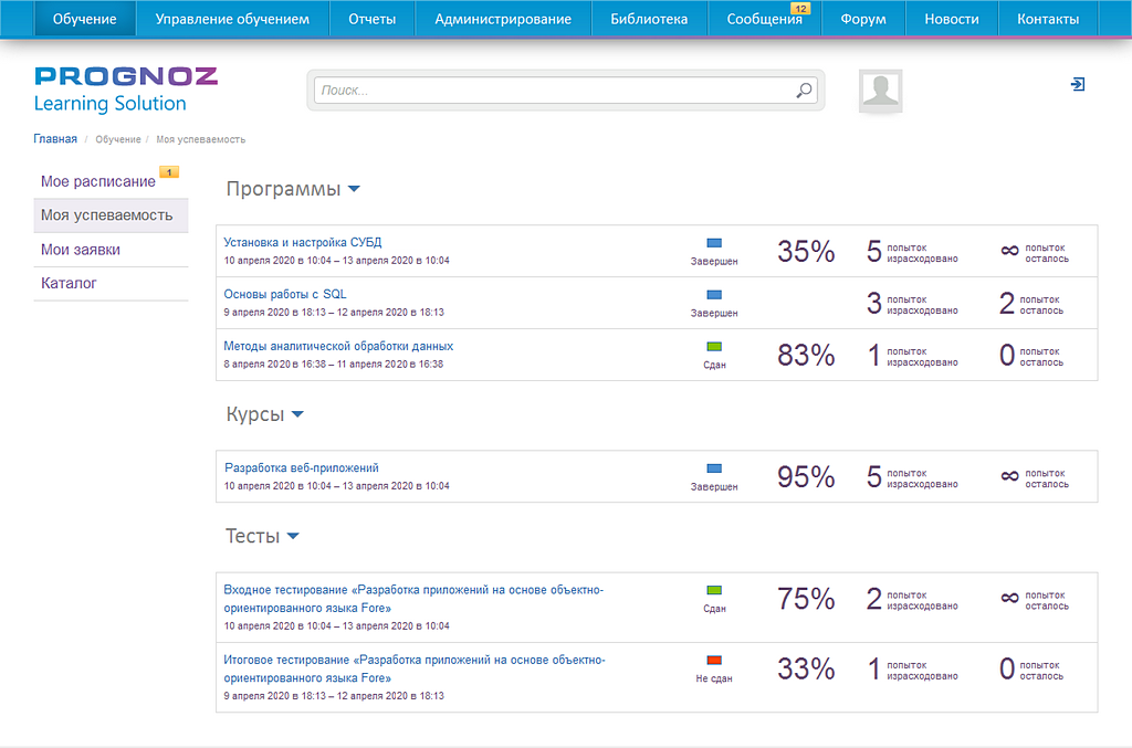 Продукт «Prognoz Learning Solution» включает компоненты дистанционного обучения, средства поддержки мероприятий по проверке знаний пользователей, инструменты организации очного обучения, а также широкий набор средств коммуникаций. К функциональным возможностям системы относятся: формирование каталогов электронных и очных курсов, тестов, анкет и учебных программ (импорт, изменение, разграничение прав, а также создание курсов с помощью конструктора), автоматизация бизнес-процессов очного обучения, формирование аналитической отчетности об эффективности обучения.